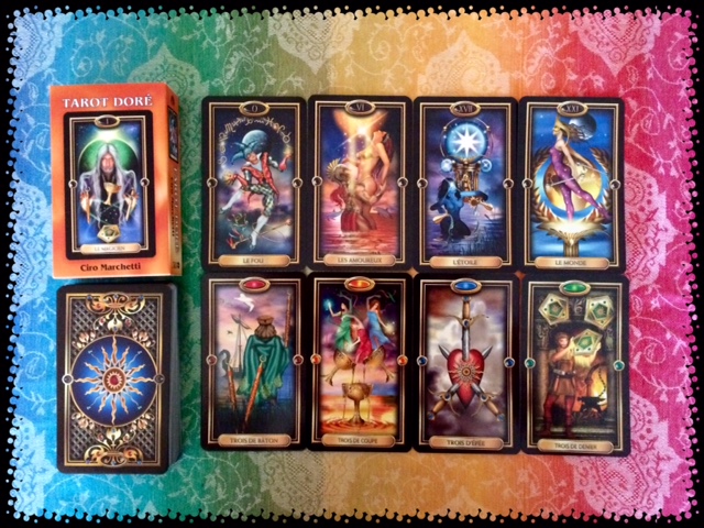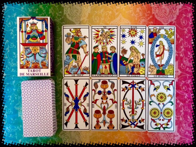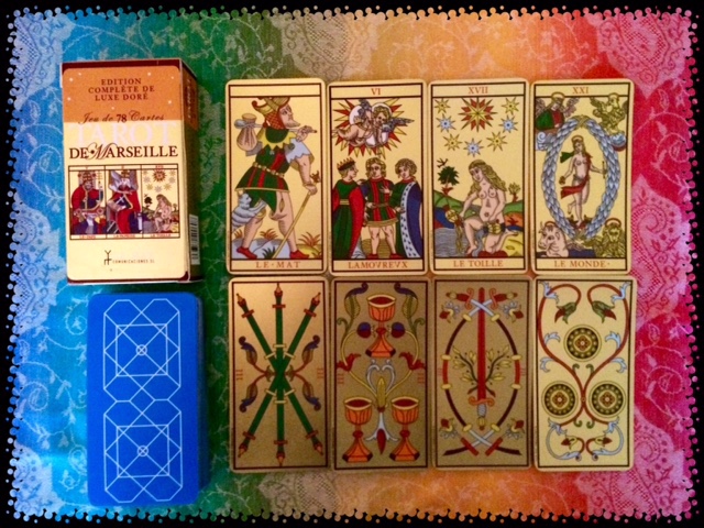 I have two Marseille tarot decks, which I rarely use, for the reasons I explained in the post about how to choose your tarot. The tarot below is a golden variation of the classical Marseille tarot.