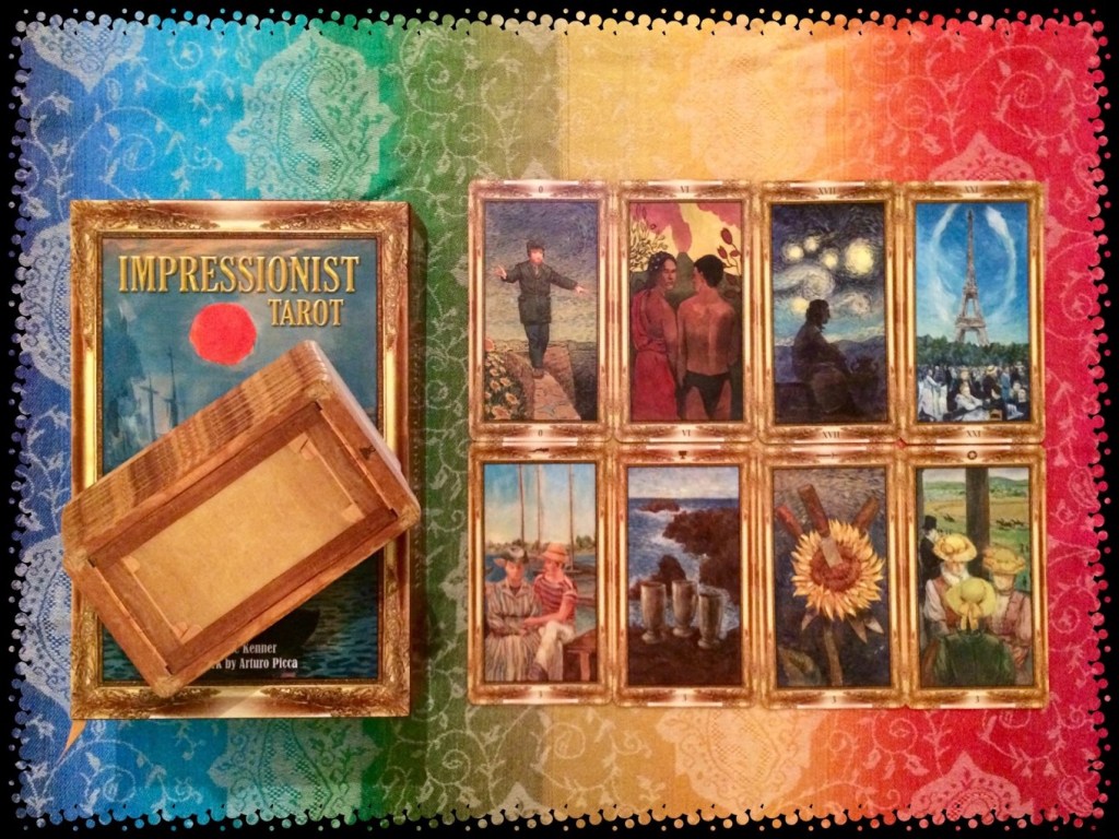 Beautiful deck, with cards based on paintings by the Impressionist masters: the suit of Wands is with Manet’s art; the Cups, with Monet’s; the Swords, with Van Gogh’s; the Pentacles, with Degas; and the Major Arcana are represented by a mixture of various artists’ illustrations.